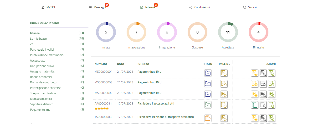 La sezione Istanze mostra in modo analitico ogni singola istanza presentata e il suo stato.