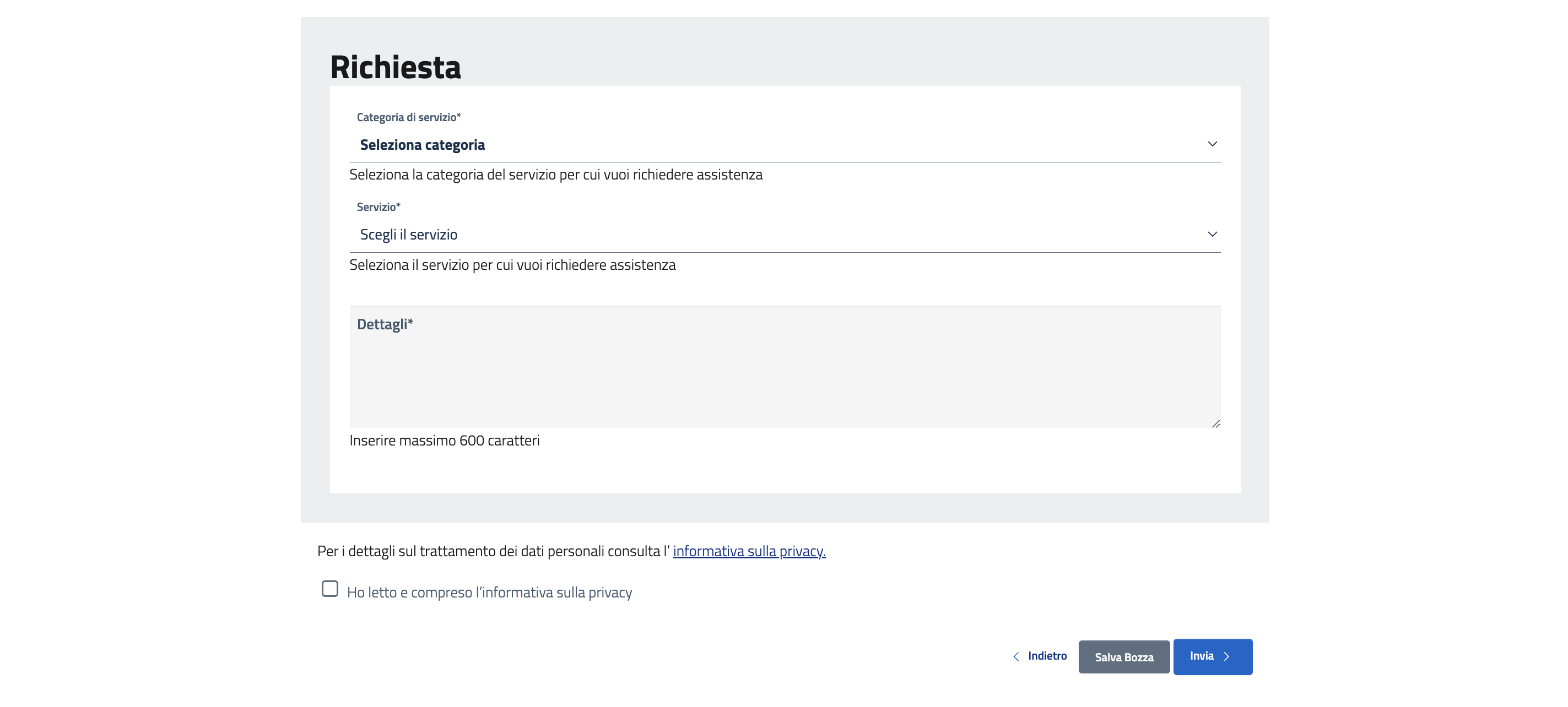 Dopo aver accettato la Privacy è possibile Salvare in bozza per proseguire la compilazione in un secondo momento, oppure premere Invia, per inviare l'istanza.