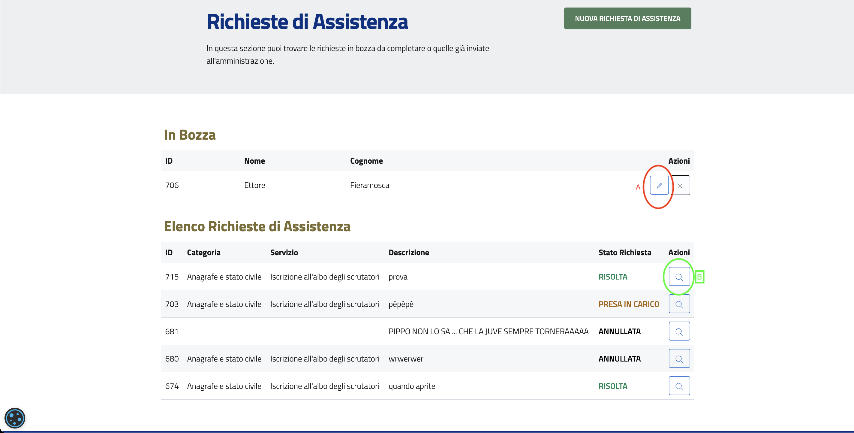 Cliccare sulla matita A per completare una richiesta in bozza, oppure sulla lente di ingrandimento B per visualizzare i dettagli delle richieste inviate.
