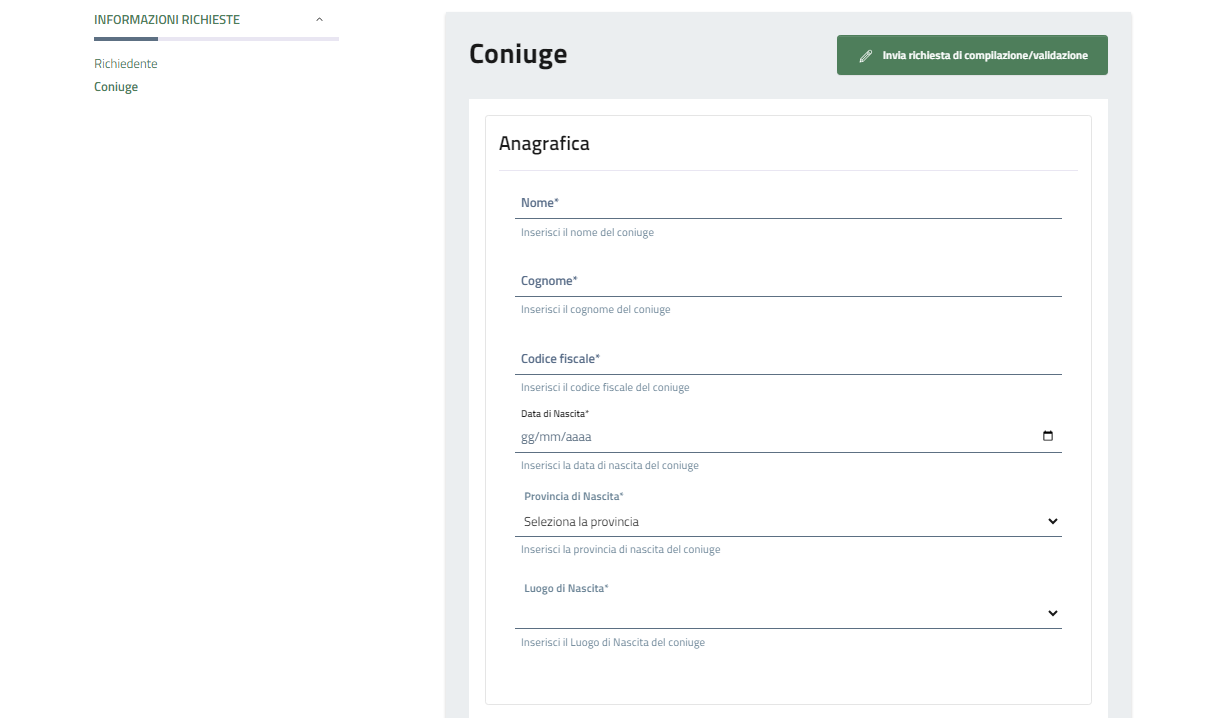 I dati del coniuge possono essere compilati dalla persona che ha effettuato il primo accesso, oppure compilati direttamente dal coniuge dopo avere inviato la richiesta.