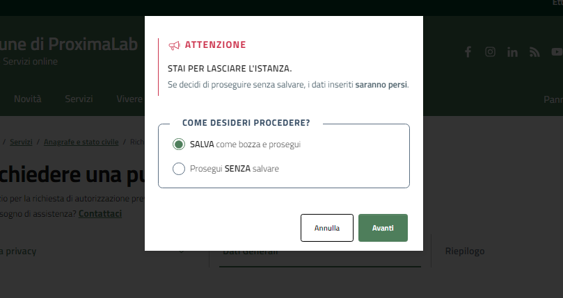 Se durante la compilazione, per qualsiasi motivo, dovessimo uscire dalla compilazione, comparirà il seguente messaggio che ci permetterà di salvare o uscire senza salvare l'istanza.
